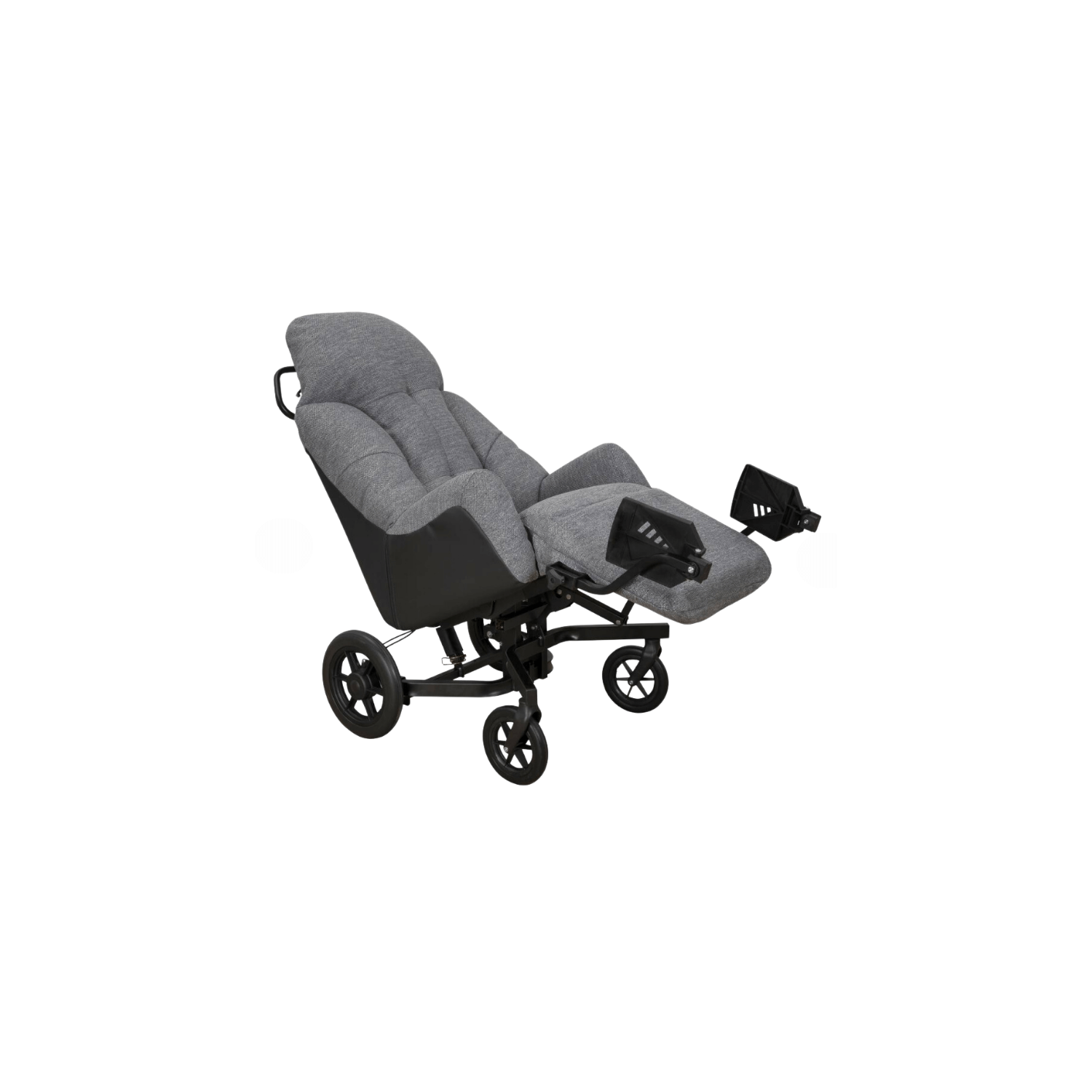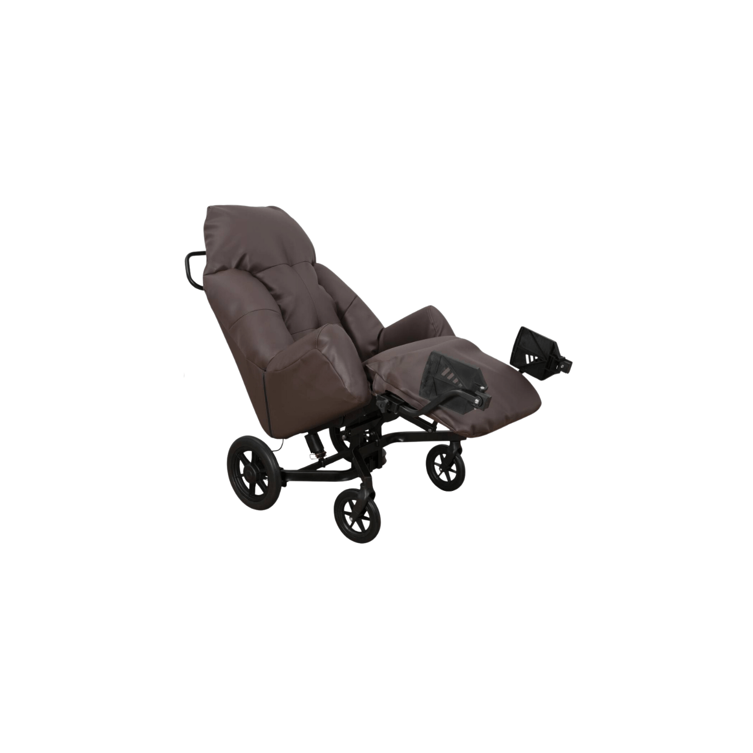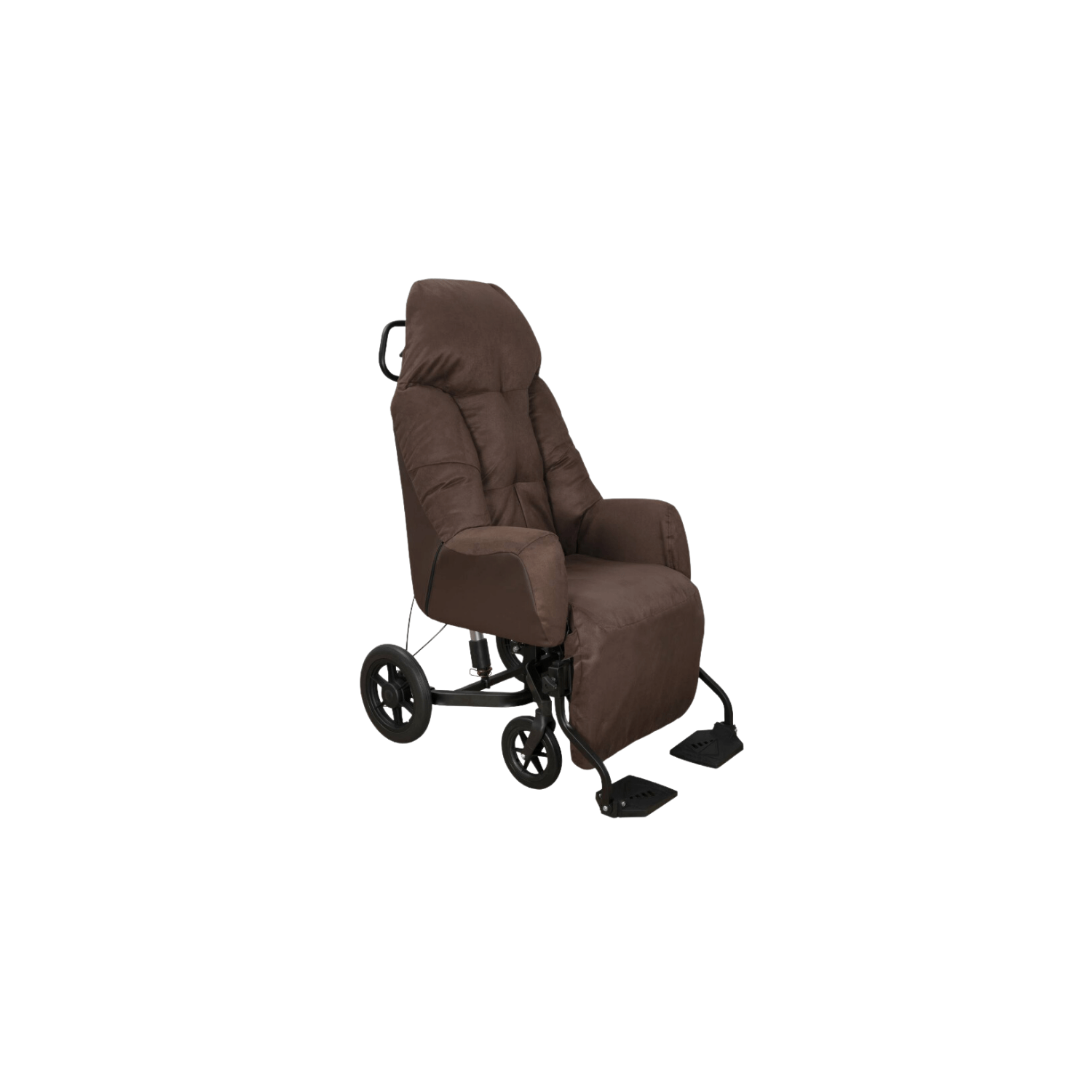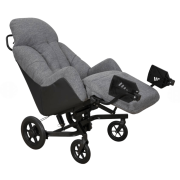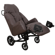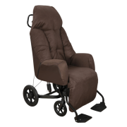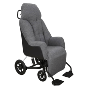 Le fauteuil est équipé de roues avec freins tambours situés à l'arrière, et d’une barre de poussée pour permettre à l’aidant de manier le fauteuil facilement.
